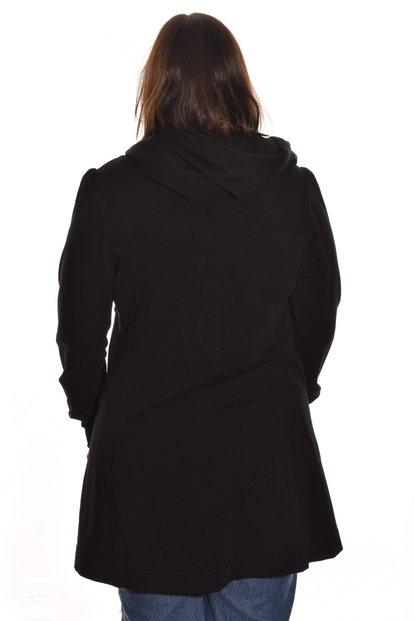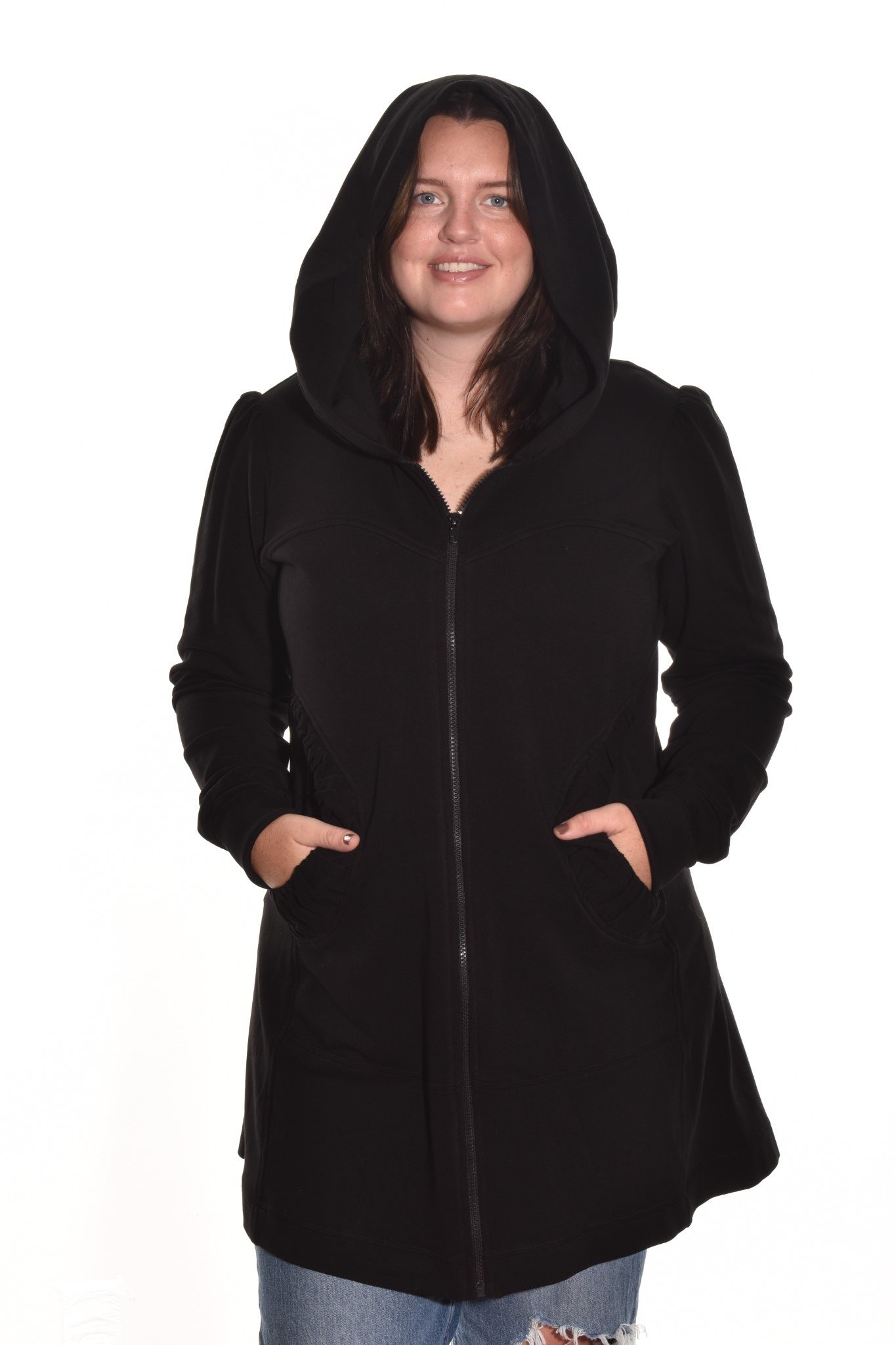 This long hooded sweatshirt jacket has a zipper front, full length sleeves with two front pockets with ruched contrasting fabric detail. Pair with leggings or jeans.