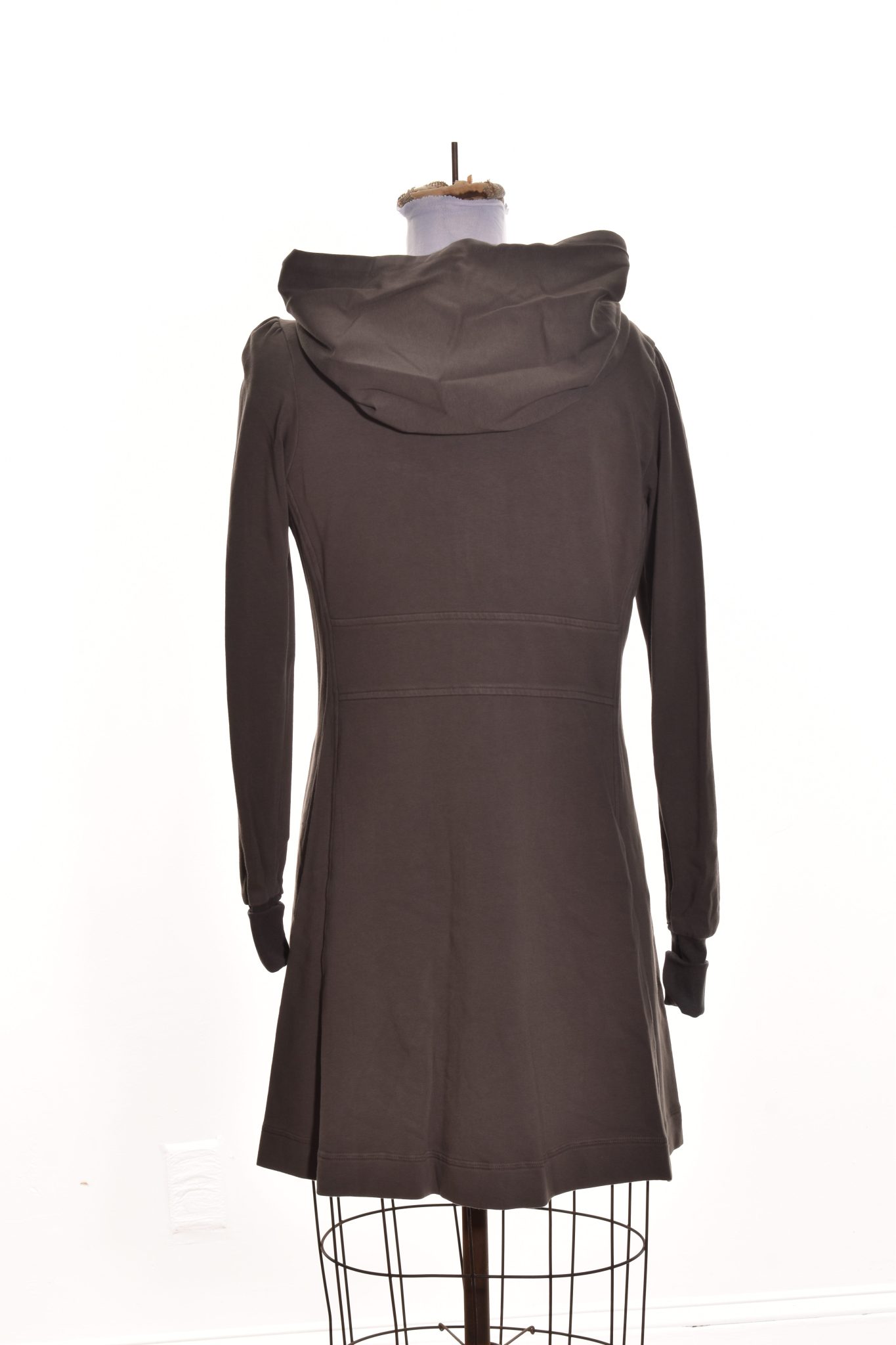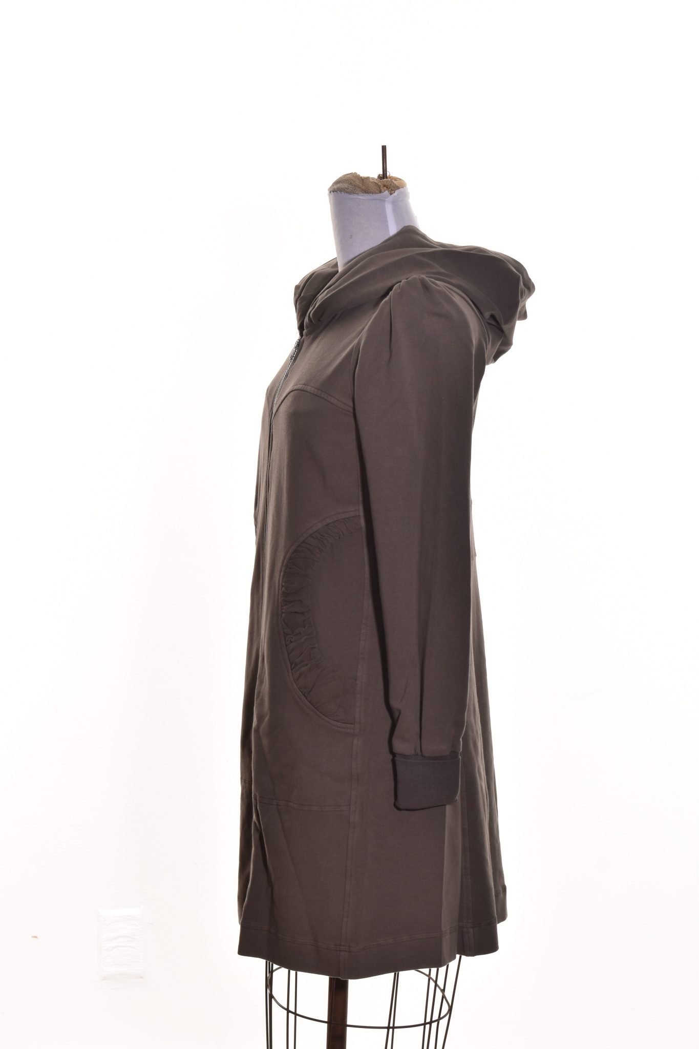 This long hooded sweatshirt jacket has a zipper front, full length sleeves with two front pockets with ruched contrasting fabric detail. Pair with leggings or jeans.