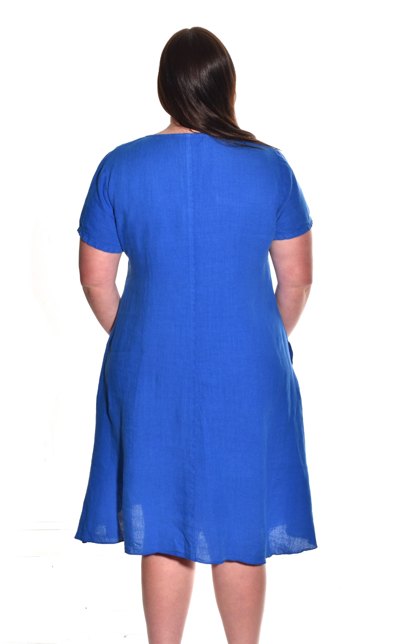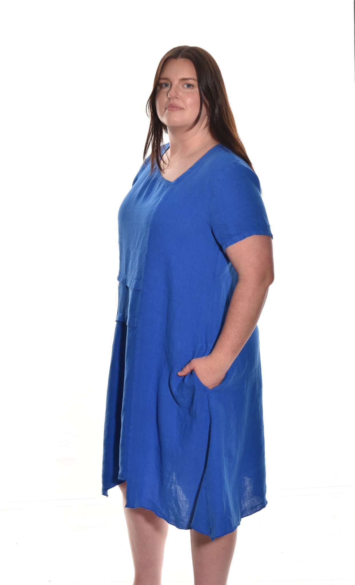 Special details elevate this easy to wear dress. Asymmetrical tucks elevate the mid section of this dress in the most figure flattering way. The common theme is asymmetry as we see at the neckline and again at the hemline resulting in an artful design. Slightly A-line with short sleeves and side seam pockets. Made up in a lovely medium weight linen.