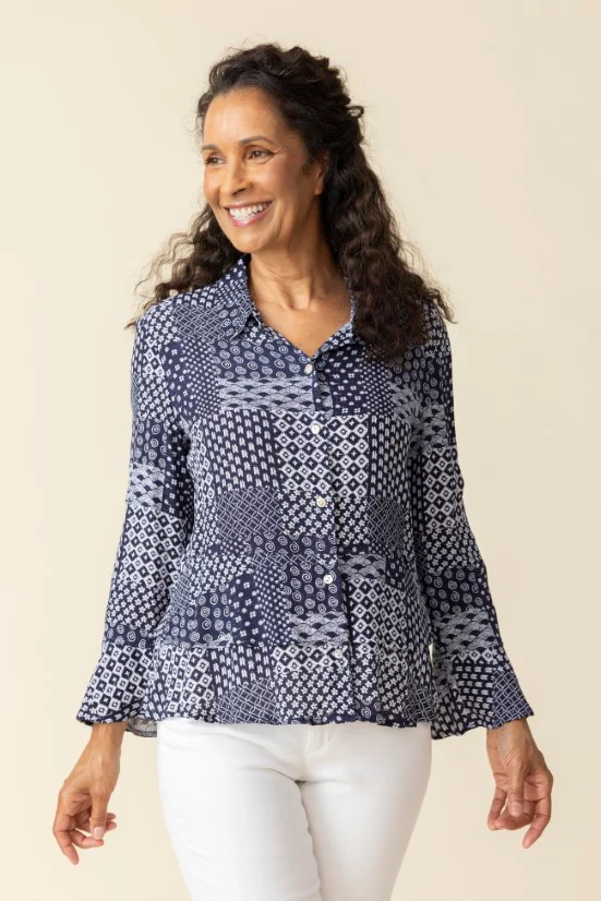 Our best selling style in an exclusive new print. Viscose, rayon crepe drapes beautifully and travels well. Flounce at sleeves and hem add feminine appeal. Agoya shell buttons, flounced hems, exclusive print, easy fit.