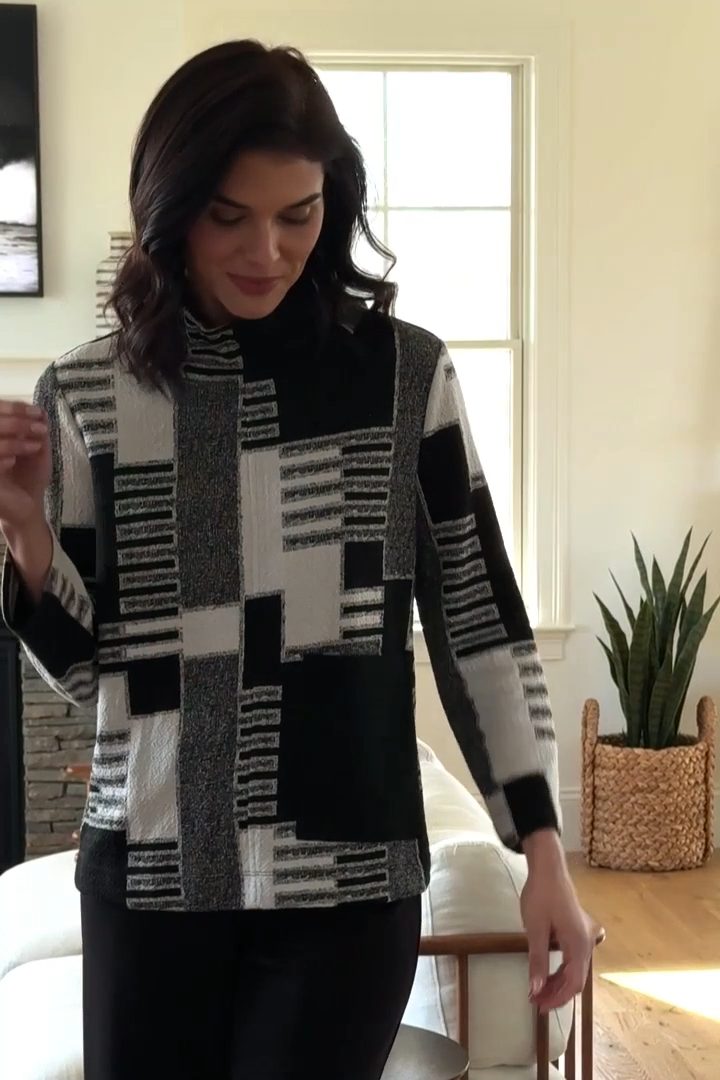 Mixed jacquard knit patterns combine for a modern vibe. Collar is ruched with a wire to hold its shape and bend to your liking.Oversized front pocket and bracelet length sleeves add a retro flair. Perfect paired with our Ponte bottoms.