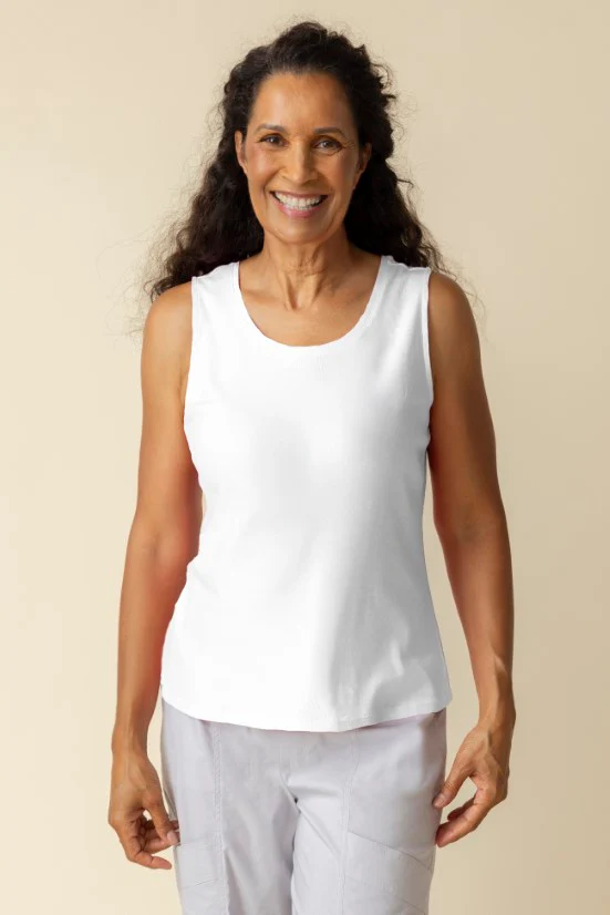 A go to basic in super soft 1×1 rib cotton. Bra friendly straps, relaxed body, slimming fit. Suitcase ready. 100% Cotton, bra friendly.