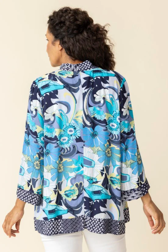 Vintage floral and diamond print adds an artful flair to this versatile Kimono/cover up/lounge piece. Viscose/Rayon holds its shape, travels well and drapes beautifully., 3/4 Sleeve.