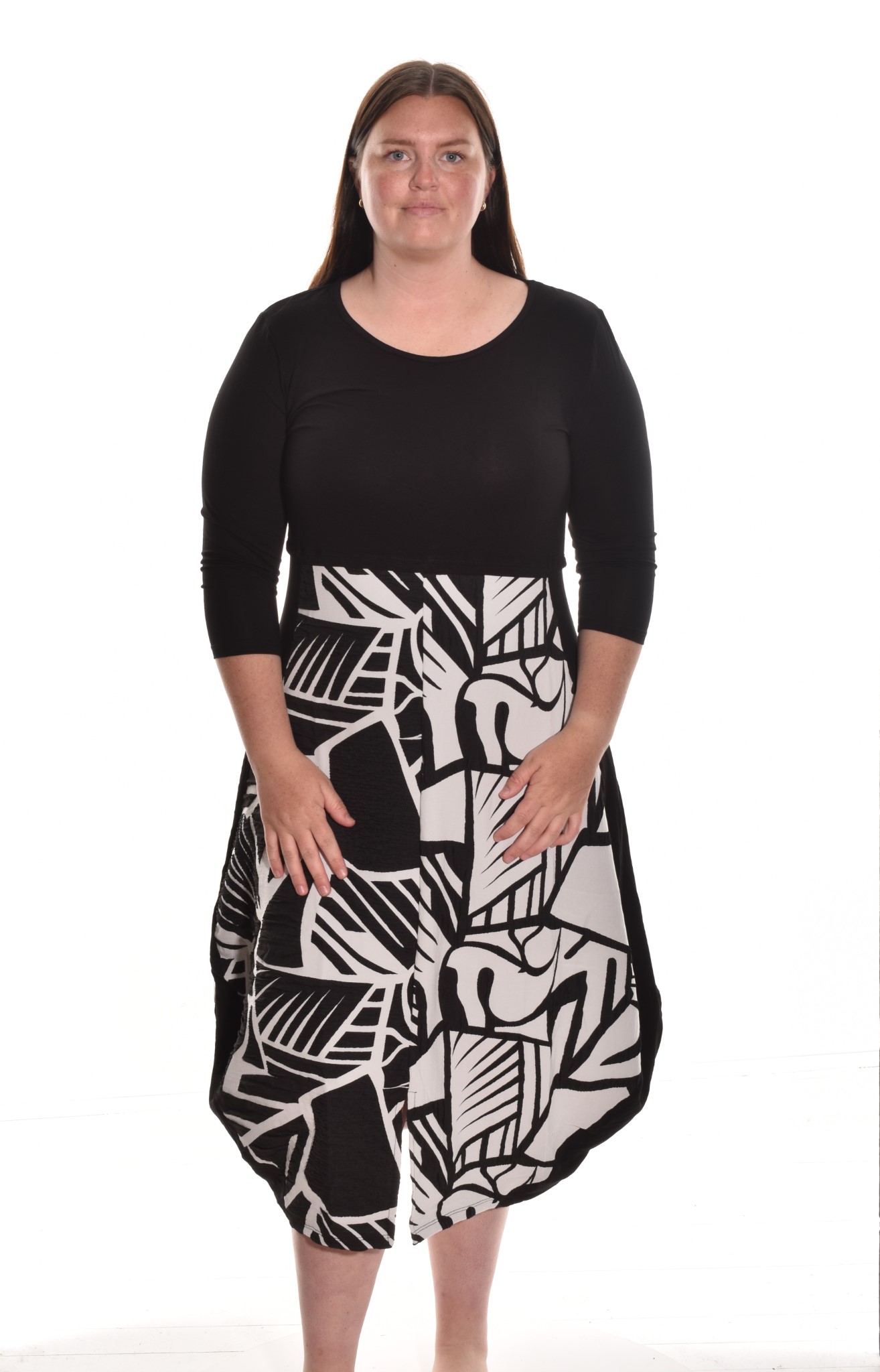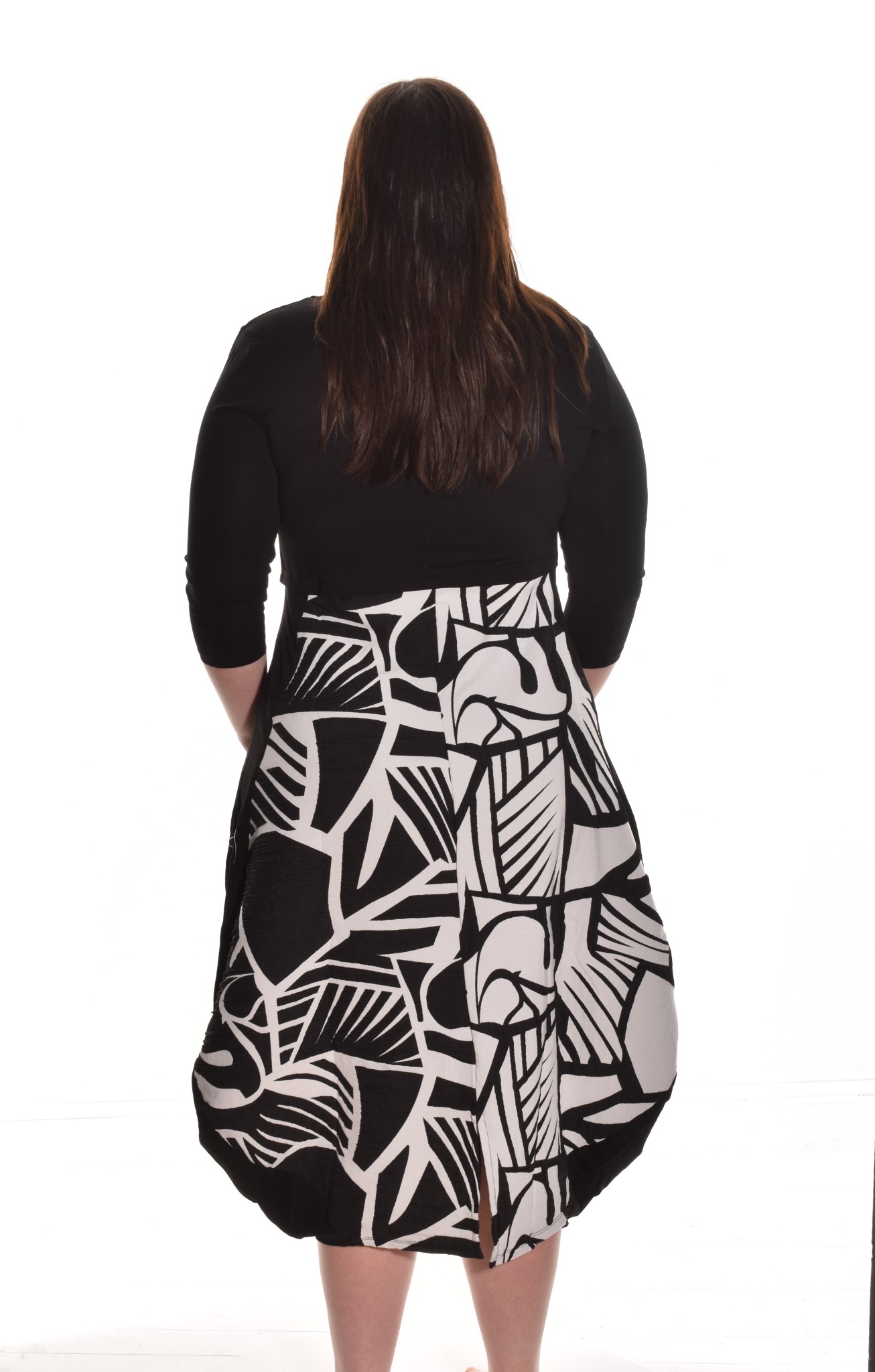 The Jessica Dress, another customer favorite. Dresses are not always easy to fit but this dress continues to amaze with it’s ability to flatter the figure. The jersey bodice and 3/4 length sleeve meet a pleat at the center waist and the bottom incorporates a contrasting fabric and print. Solid knit runs along the sides and has a hem that tapers in at the bottom with a subtle split center.