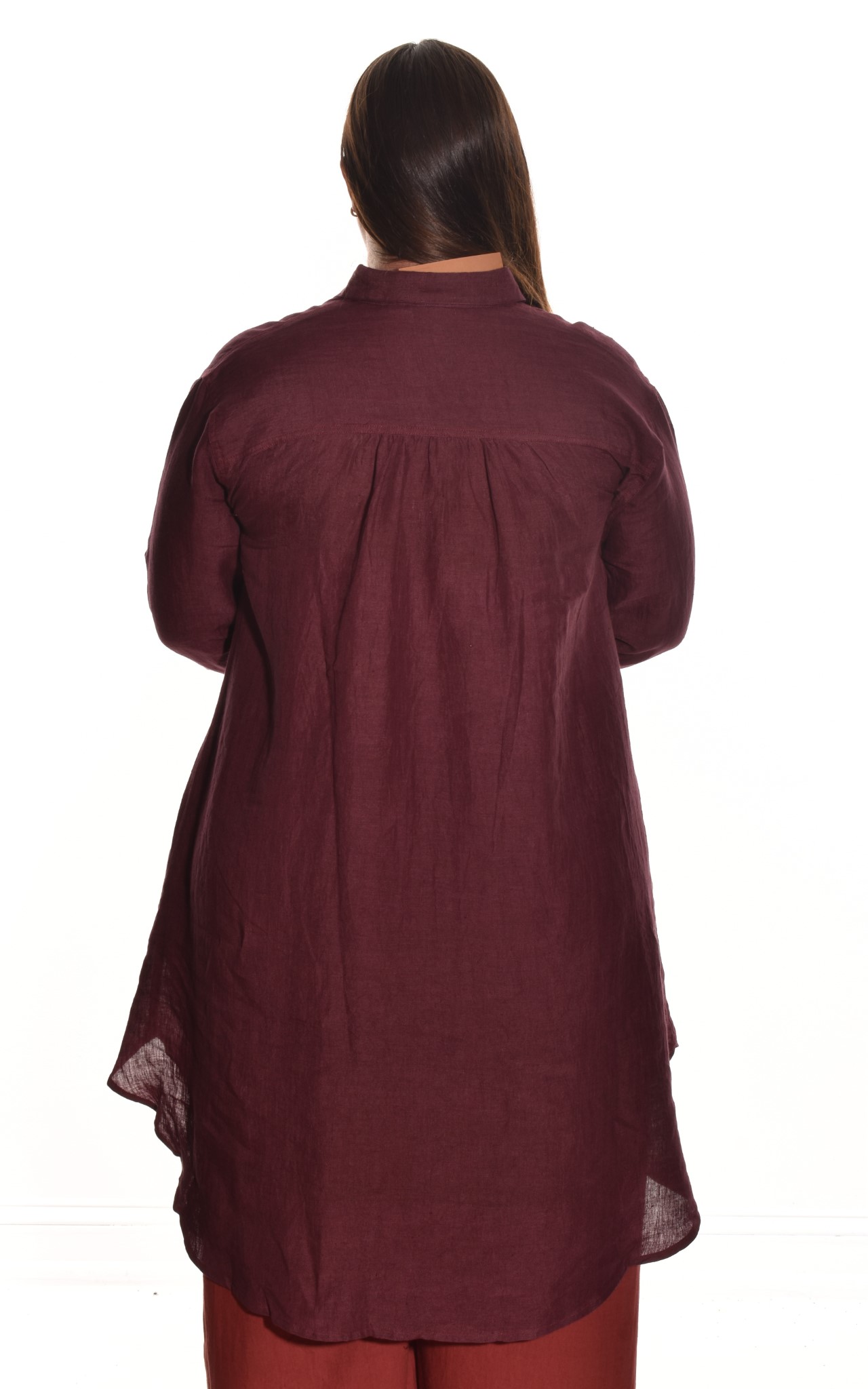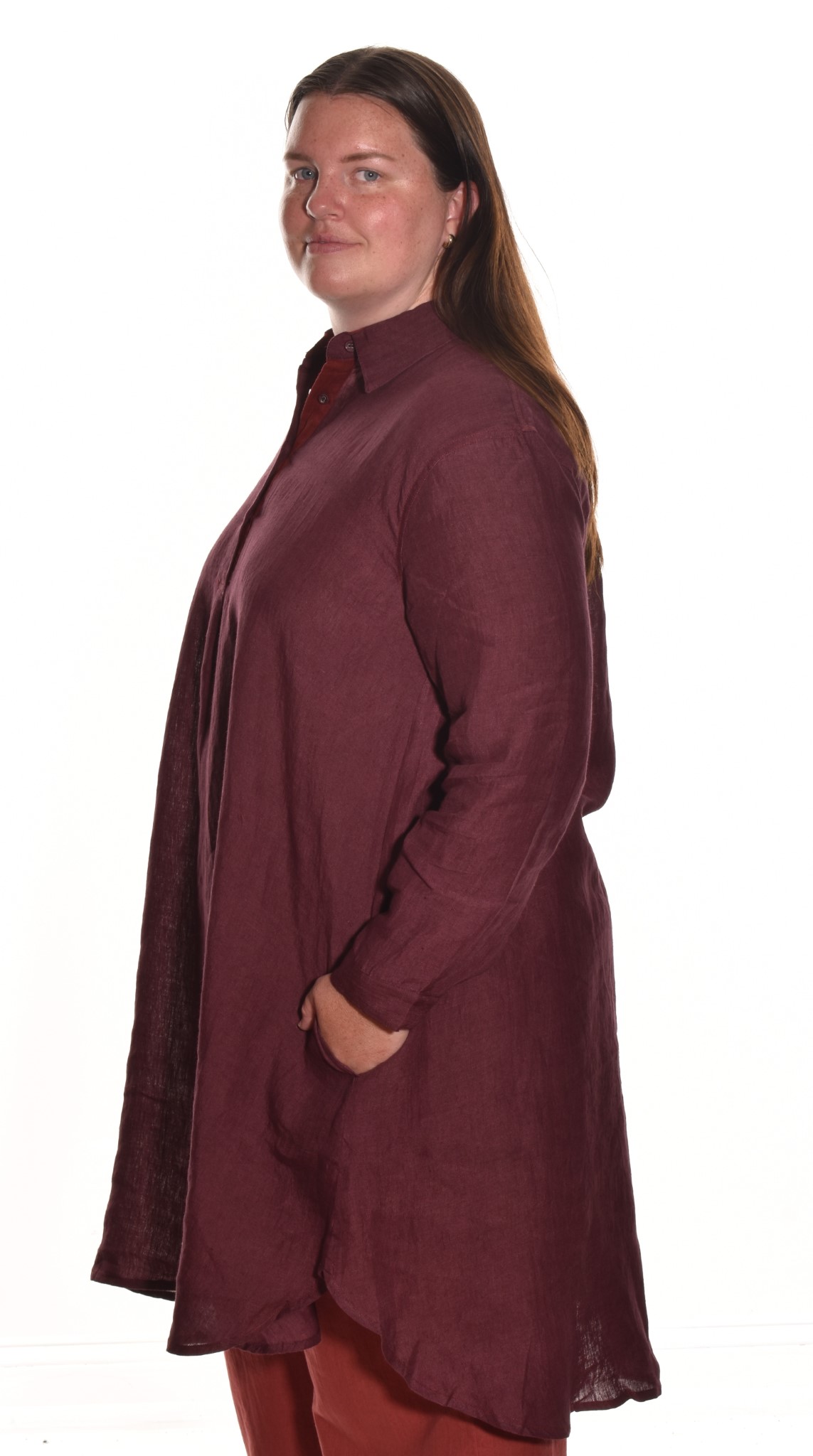 Our handwoven linen dress features a generous A-line silhouette with a curved hi-low hemline. Details include a classic shirt collar and full length sleeves at the button cuff. Side pockets at the seam to stash your essentials. Emily is wearing a size Large in this image.
