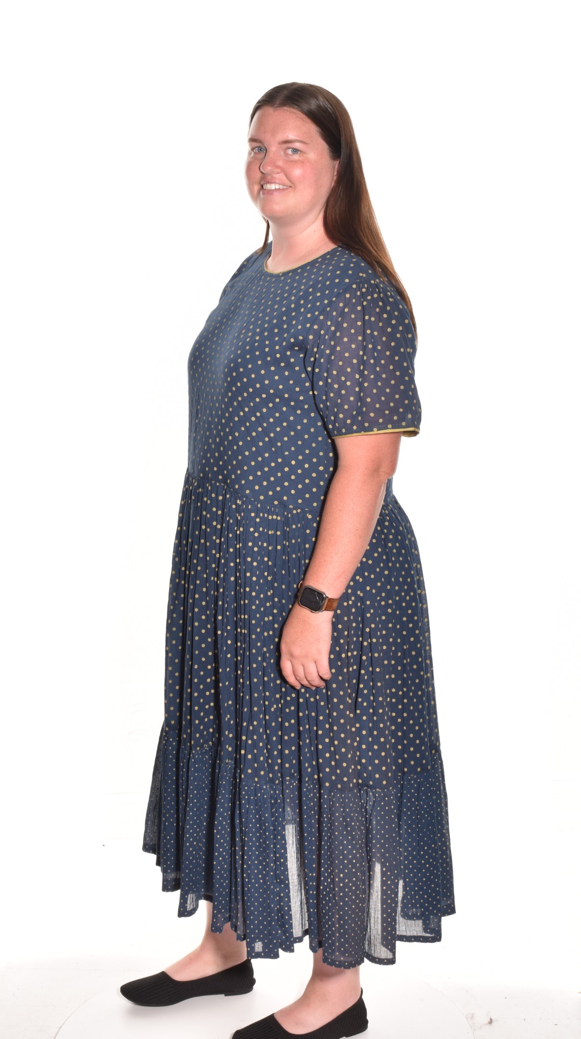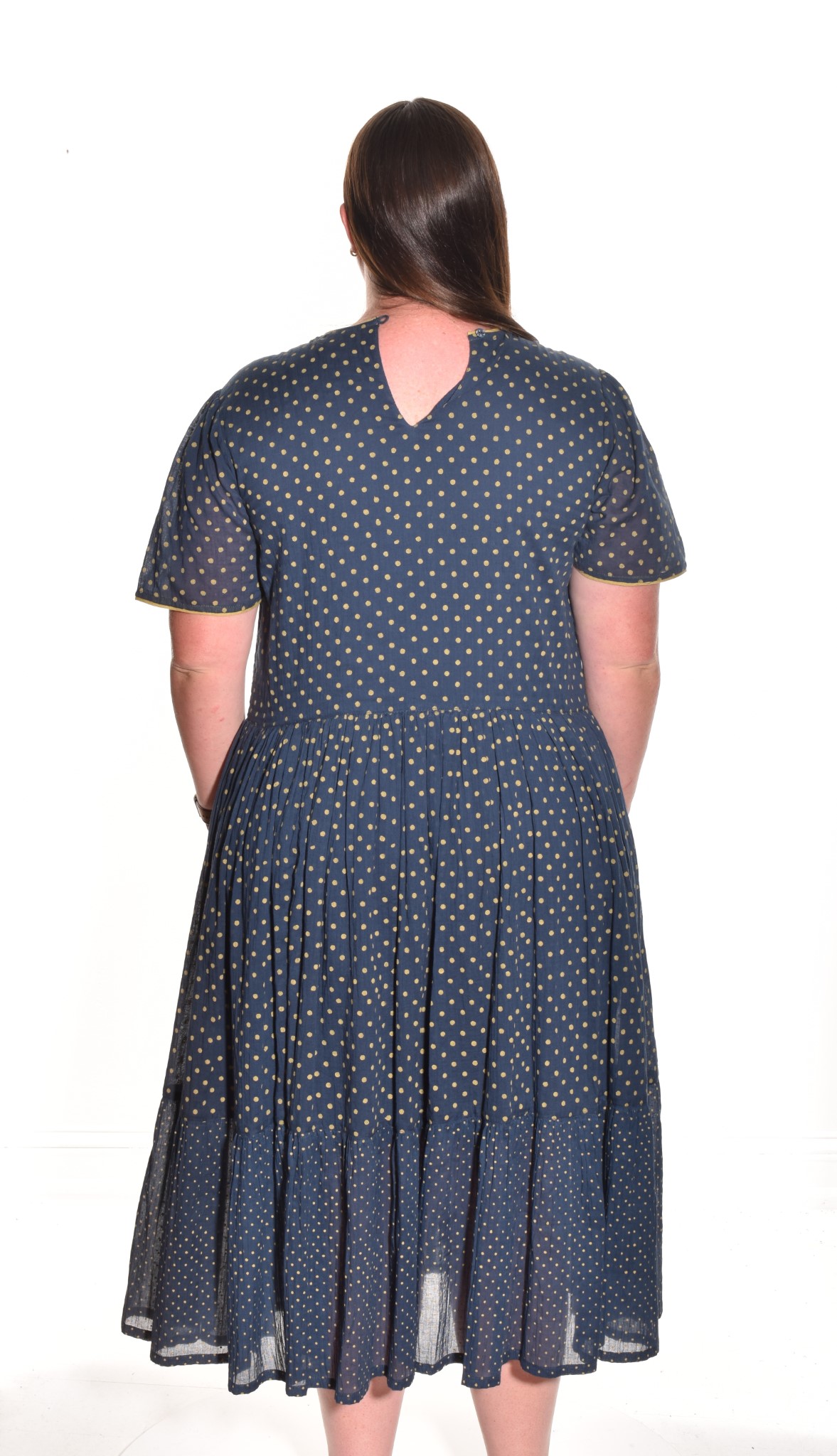 Summery and sweet, this mix of handblock polka dots is made from voile cotton. Lining that keeps it from being sheer while still keeping light and airy. This tiered style features a drop waist, short sleeves and a round neck with a keyhole button at the back neck. Olive piping at the sleeves and neckline elevate this beautiful dress. Wear this dress while visiting outdoor markets, garden parties and twirling.
