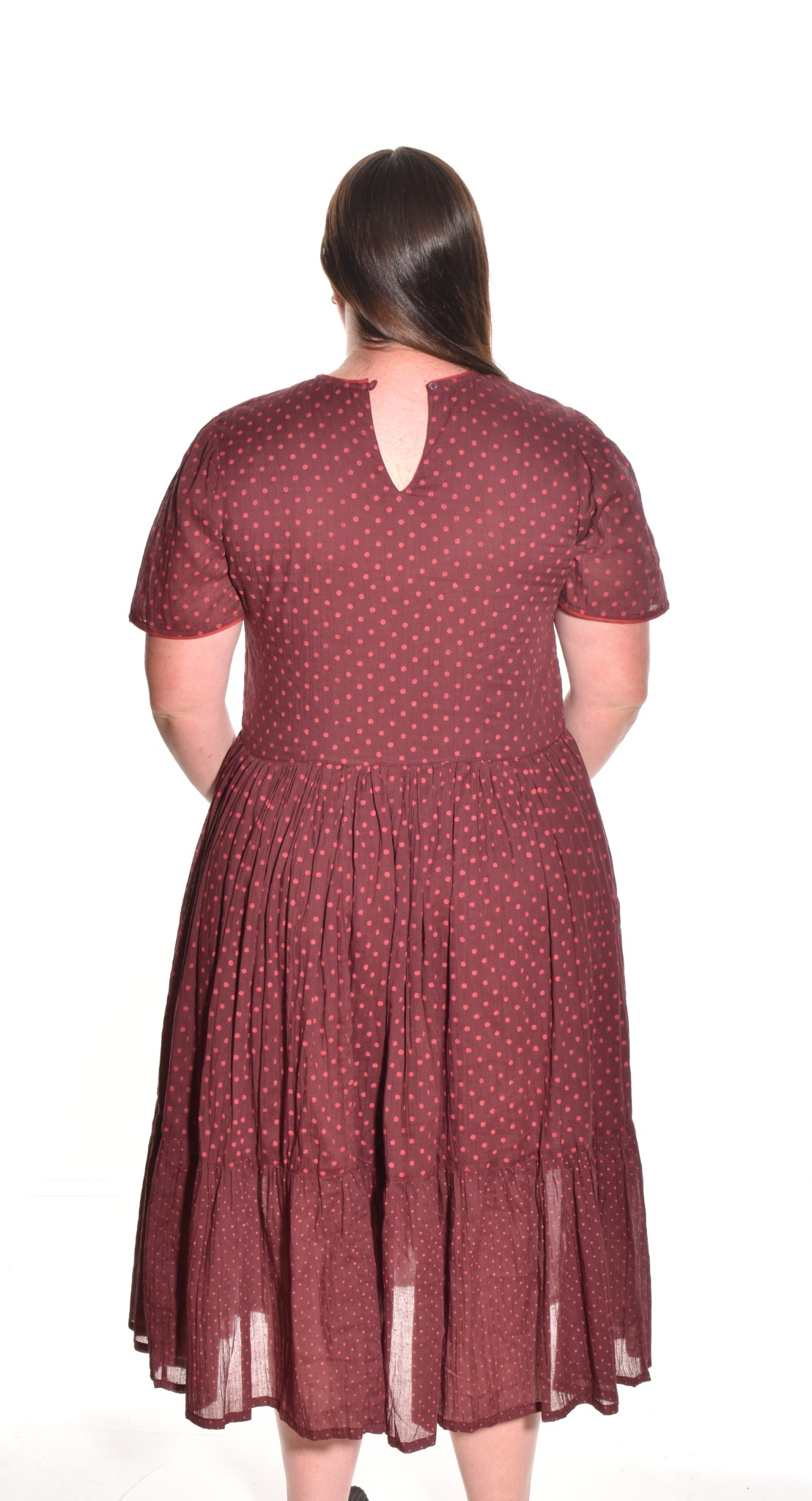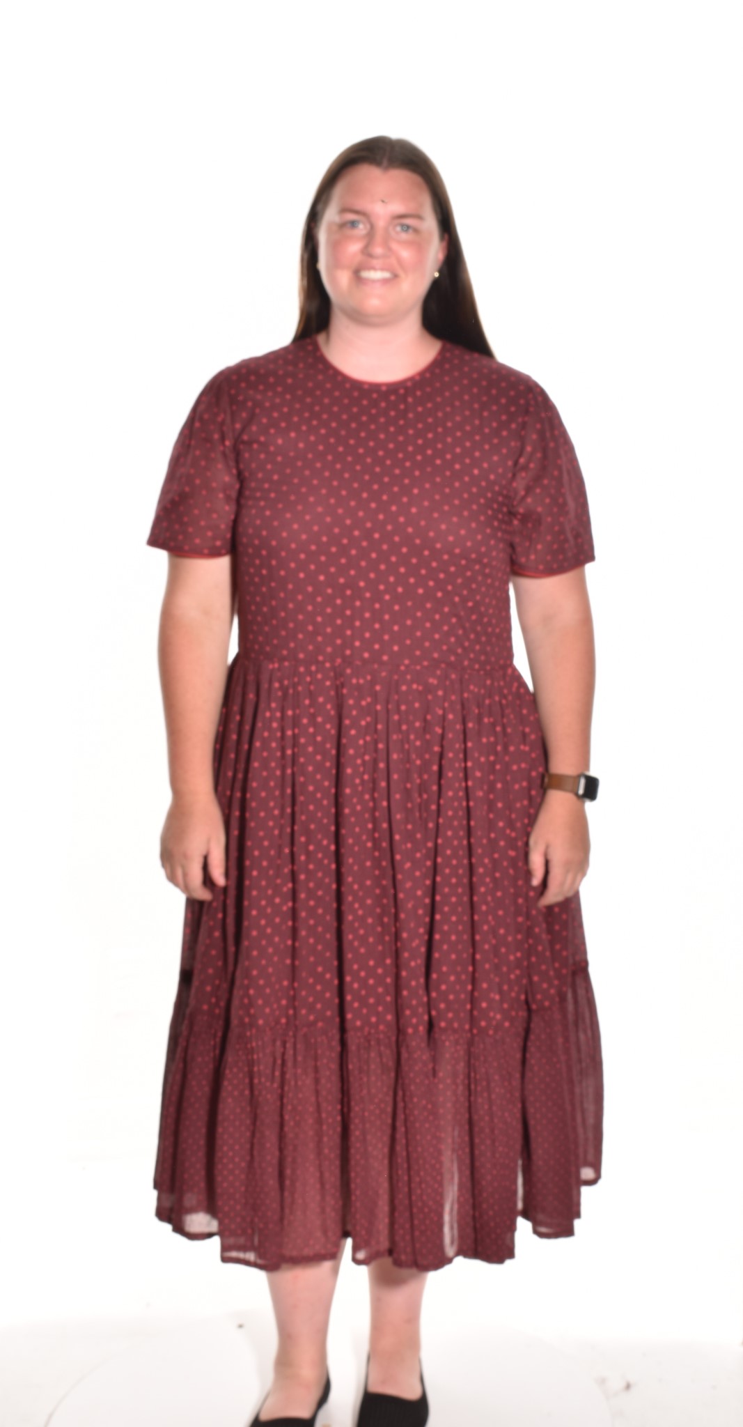 Summery and sweet, this mix of handblock polka dots is made from voile cotton. Lining that keeps it from being sheer while still keeping light and airy. This tiered style features a drop waist, short sleeves and a round neck with a keyhole button at the back neck. Olive piping at the sleeves and neckline elevate this beautiful dress. Wear this dress while visiting outdoor markets, garden parties and twirling.