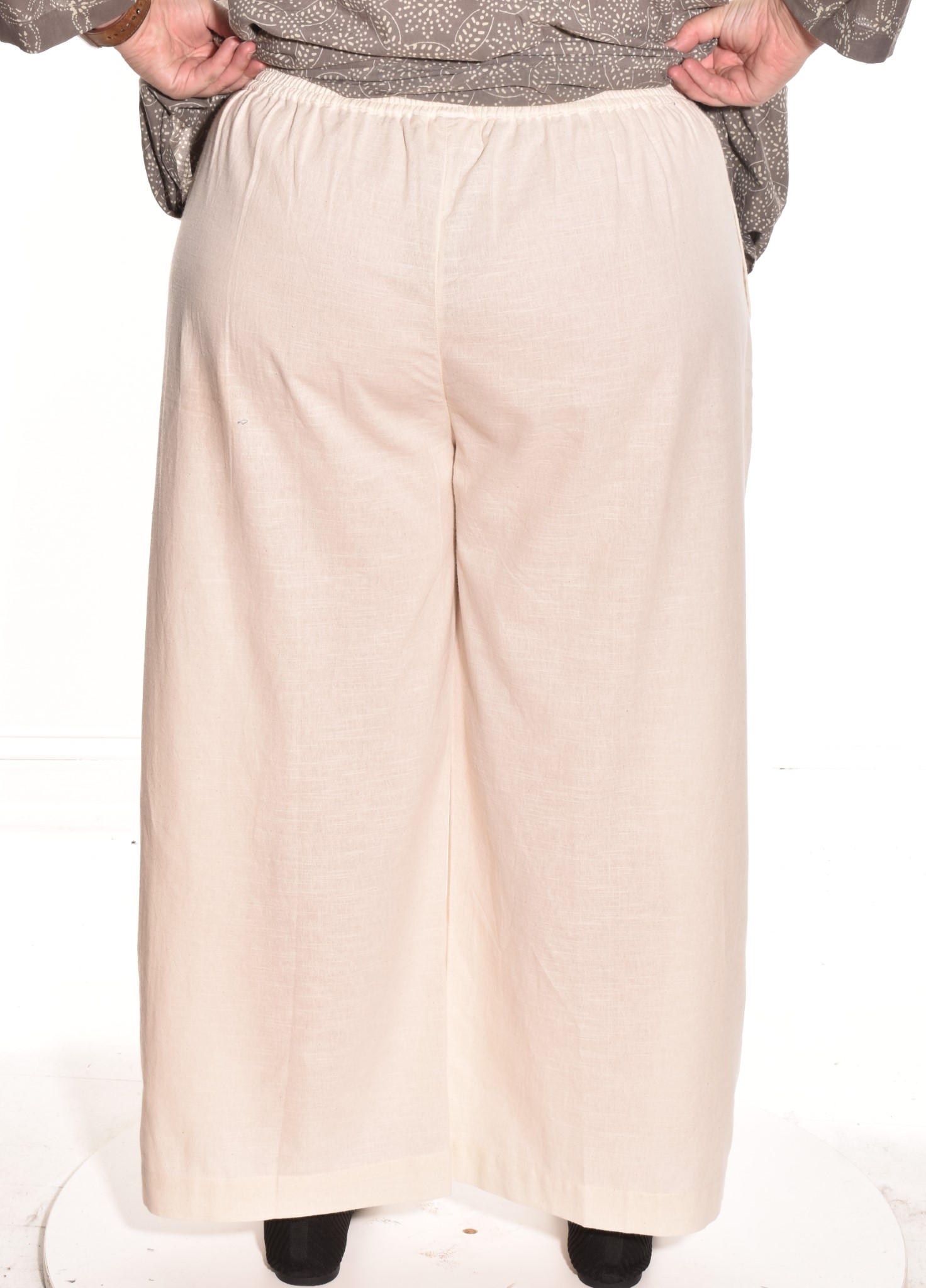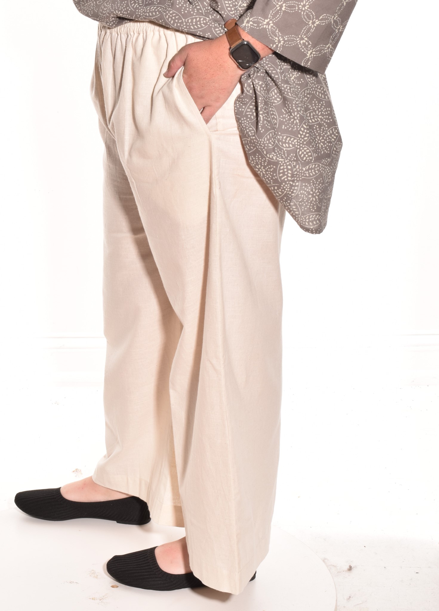 Light and airy in Organic Cotton Slub, this easy to wear pull-on pant has an elastic waistband and wide legs that hit most full length. Deep side pockets perfect to stash your essentials. 25 inch inseam. Fits Generous.