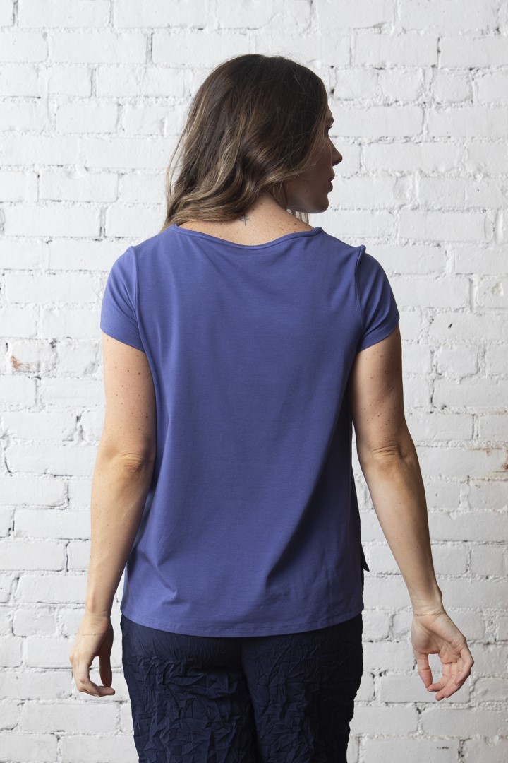 The Crop Sleeve Tee is part of the Essential Layers Collection. The silhouette is relaxed and falls slightly longer at the back. A double seam at the round neckline and down the center front elevates this simple tee style. She pairs perfectly with style, #600284, The Crop Cargo Pant.
